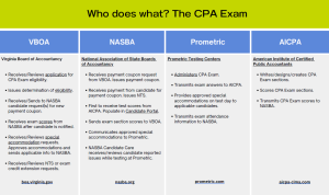 Ang proseso ng pagsusulit ng CPA ay isang pakikipagtulungan sa pagitan ng mga lupon ng accountancy ng estado, ang American Institute of Certified Public Accountants, ang National Association of State Boards of Accountancy at Prometric. Tingnan ang chart na ito para sa higit pang mga detalye.